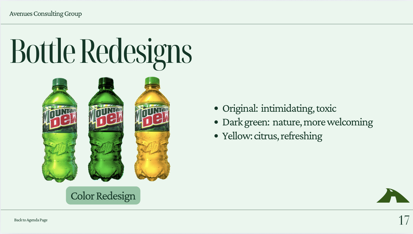 I had the opportunity to work with Mountain Dew as a client in Avenues Consulting Group. As a design consultant on their team, I spearheaded market research and strategies, bottle redesigns utilizing their new logo, and presented a slide deck alongside my team. Attached are previews of the slide deck alongside the bottle redesigns.